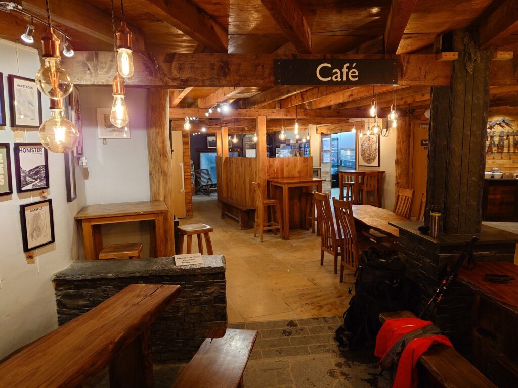 8am with the wind as bad as ever and forecast to be the same or worse until midday I made coffee and ate a Phoenix bar (500 calorie flapjack) then struck camp and staggered off the hill being blown sideways. Only 15 minutes walking and I stumbled upon the oasis that is the Honister slate mine café. Coffee, bacon sandwich, no wind, battery charging!!